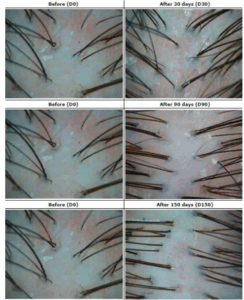 Učinkovitost izdelka je potrjena, če več kot 50 % udeležencev doseže vidno izboljšanje gostote las, kar pomeni, da lasje izgledajo polnejši, močnejši in bolj zdravi.